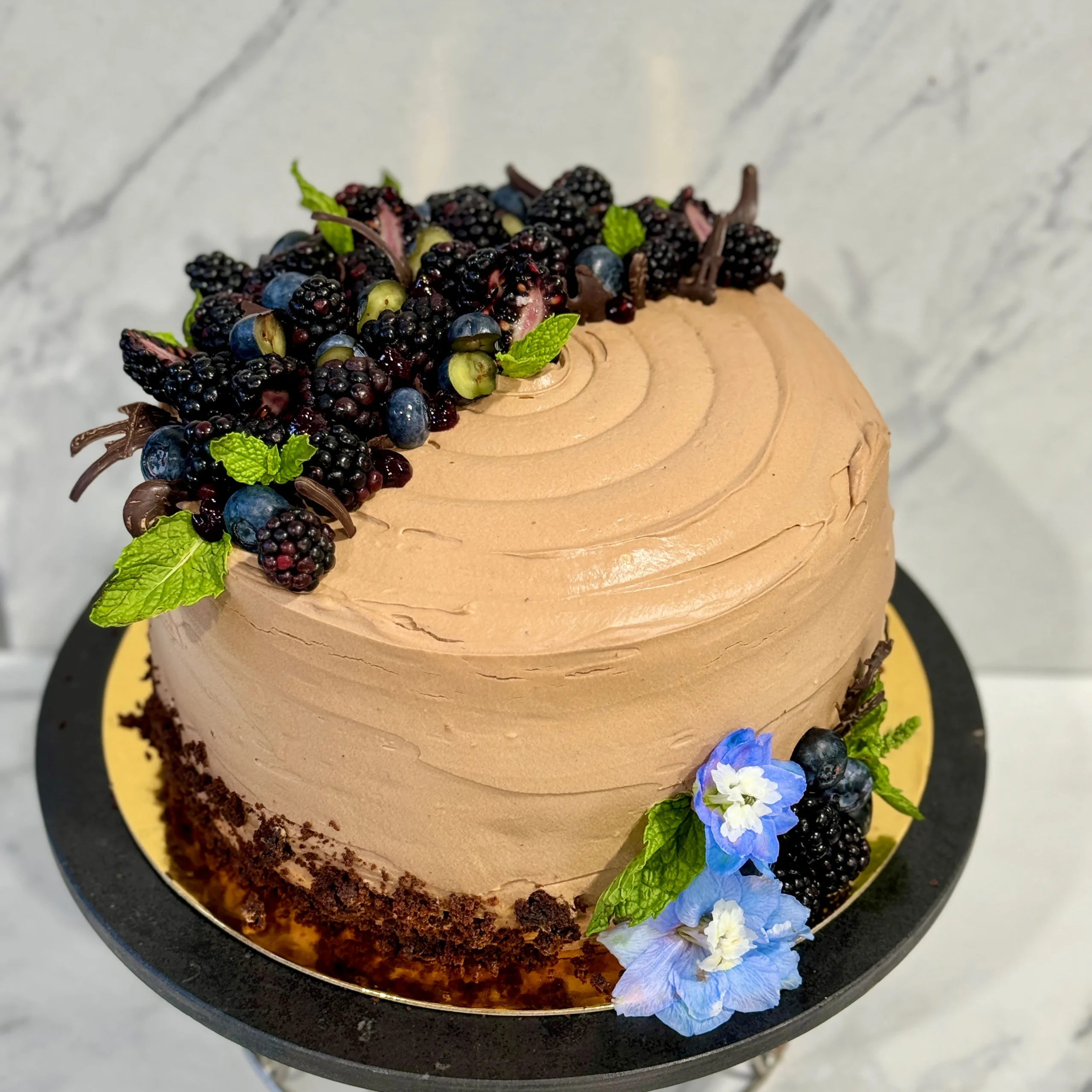 Moist dark chocolate cake layered with luscious blackberry puree and smooth chocolate ganache, finished with fresh blackberries and chocolate accents—a bold and fruity twist on a classic celebration cake.