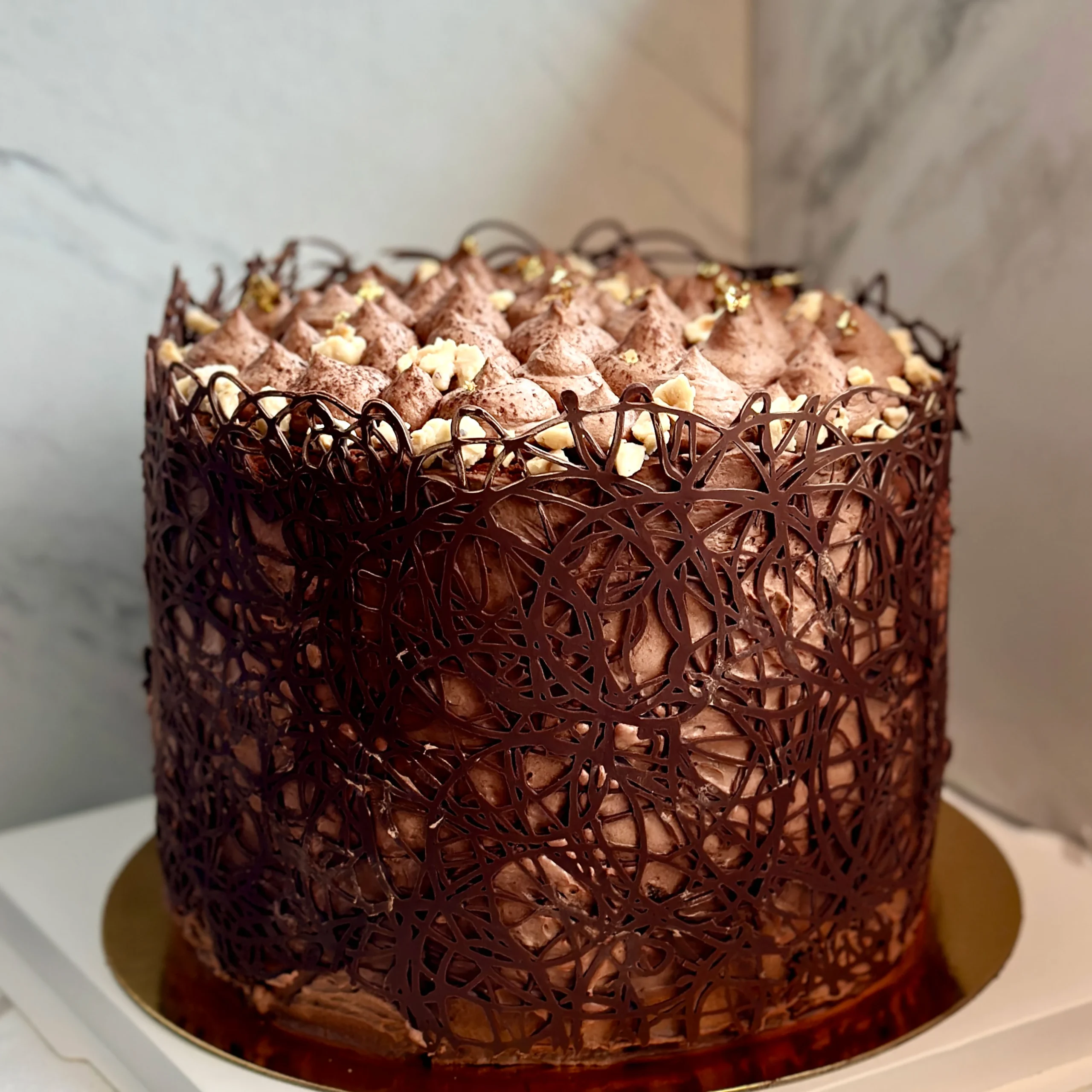 Decadent layers of dark chocolate hazelnut cake filled with velvety chocolate ganache, finished with crunchy caramelized hazelnuts and elegant chocolate decorations—bold, nutty, and indulgently celebratory.