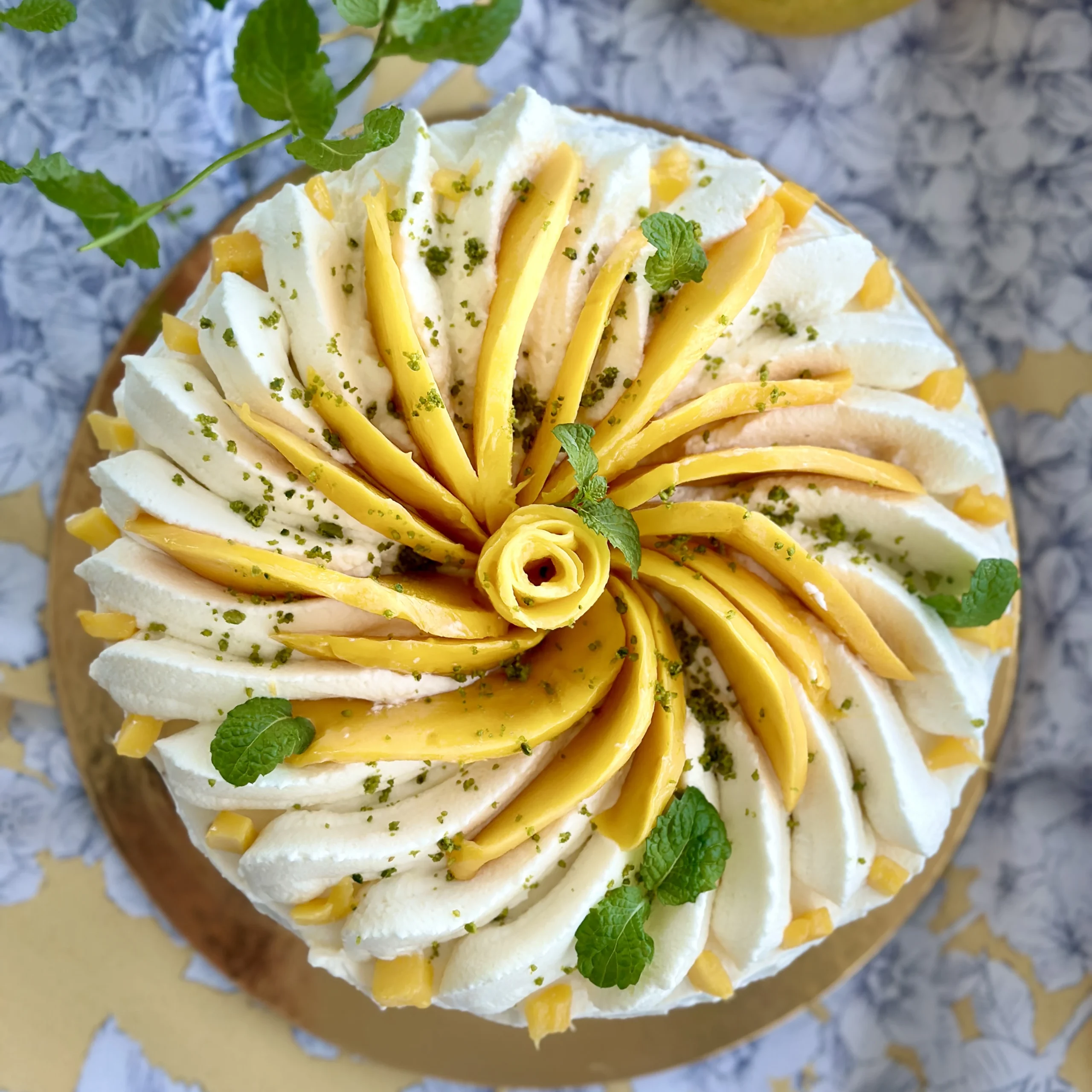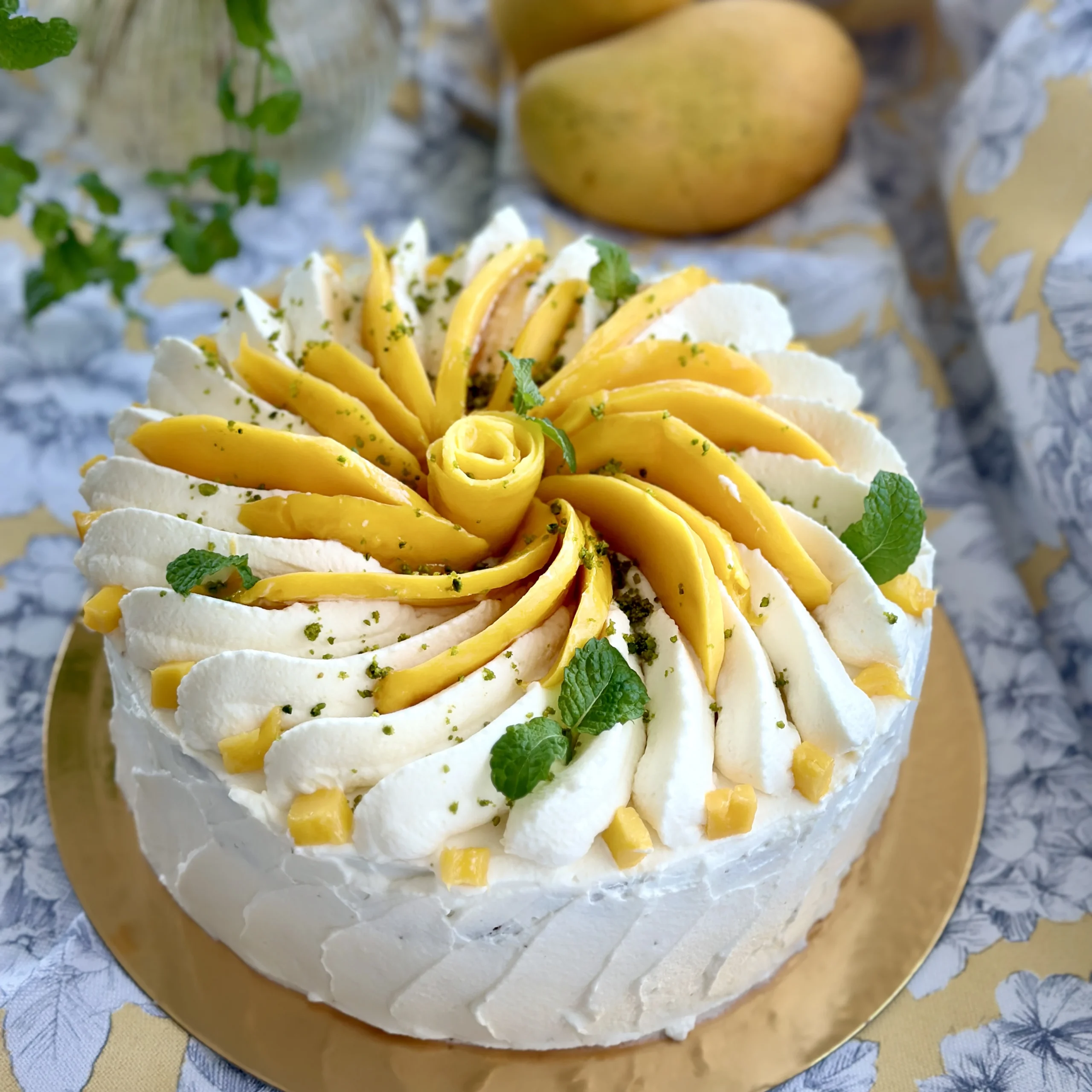 Light, fluffy sponge cake layered with mango purée and fresh mango slices, wrapped in a silky white chocolate ganache—tropical, bright, and perfect for a sweet celebration.