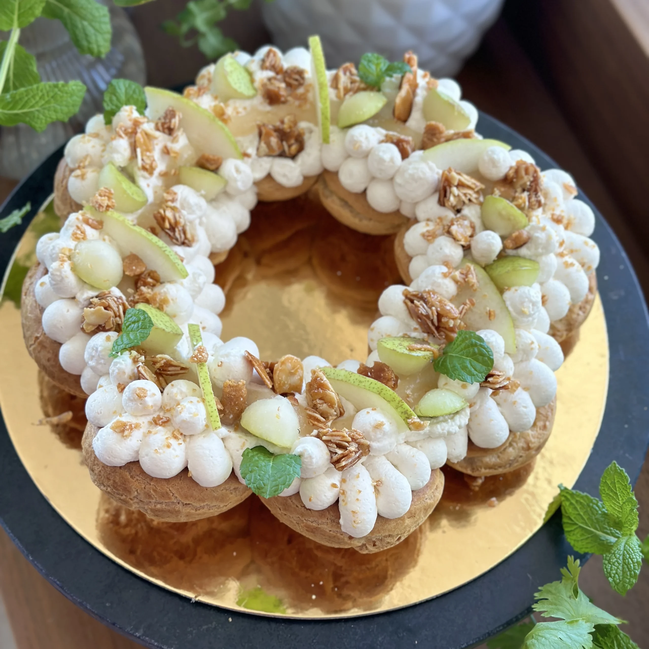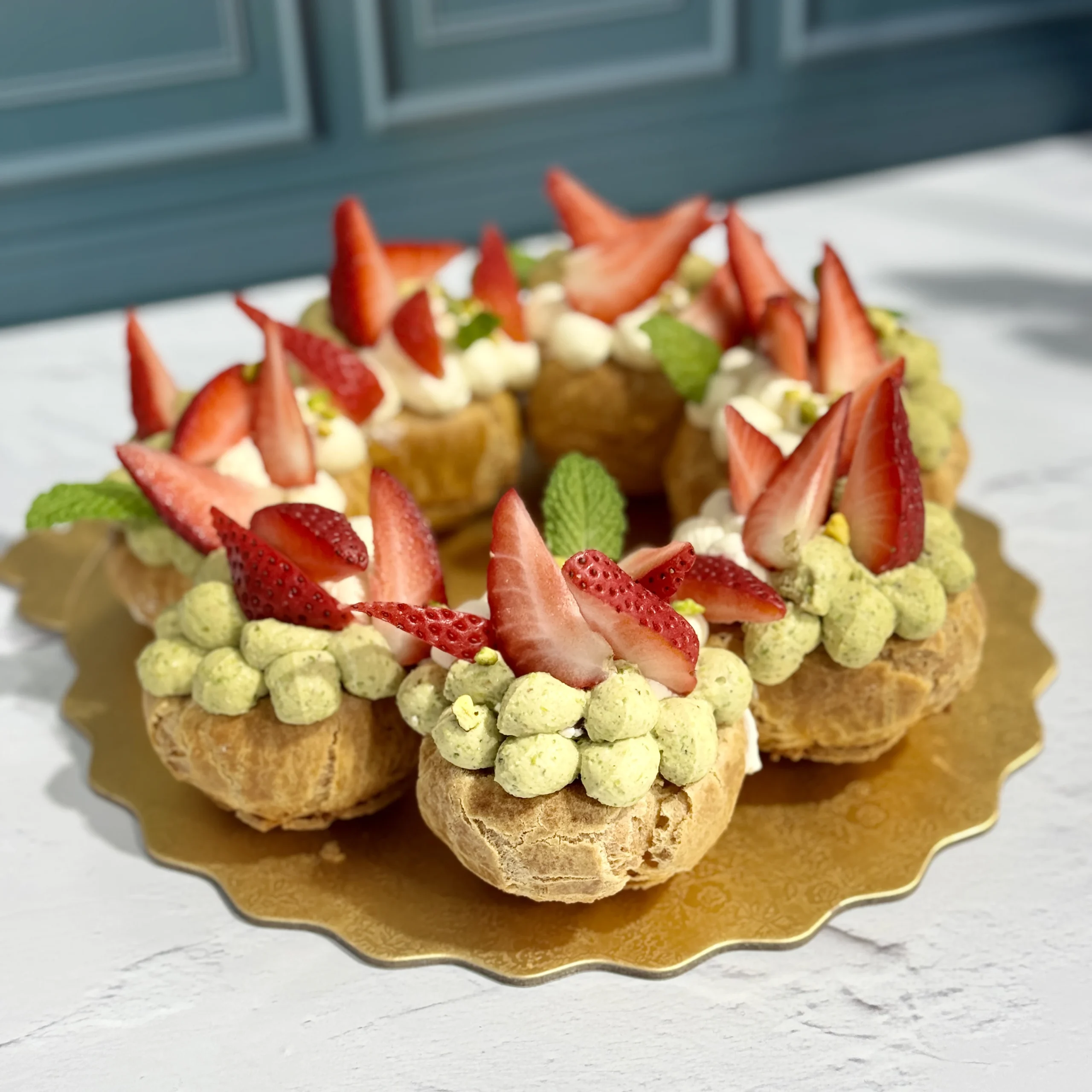 Crisp choux pastry shaped into a ring, generously filled with vanilla cream and fruit purée, garnished with toasted nuts and fresh fruit.