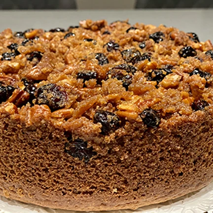 Buttery coffee cake studded with crunchy pecans and tart cranberries, delivering a perfect balance of nutty warmth and bright fruitiness.