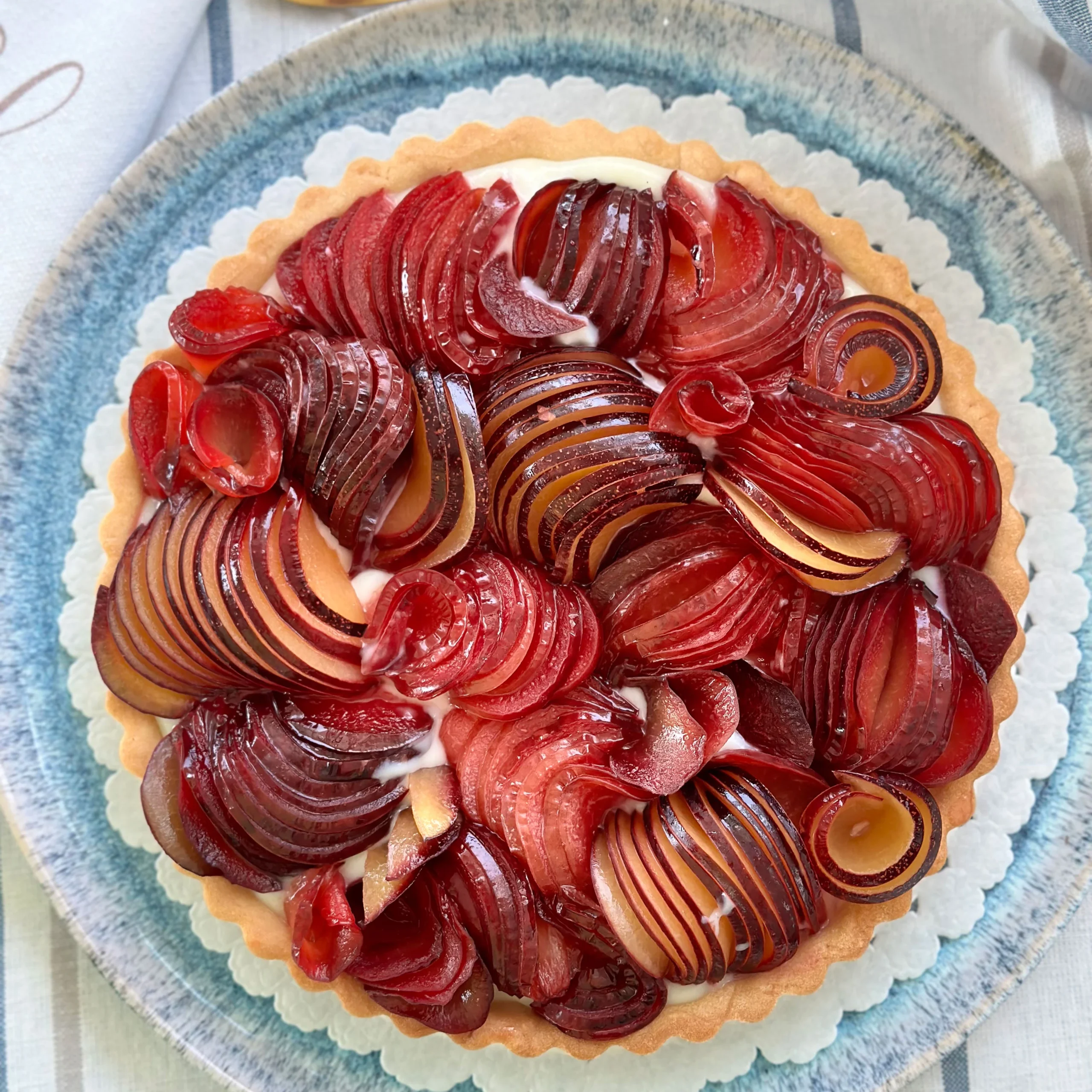 Crisp, buttery tart shell cradles velvety Crème pâtissière, crowned with a vibrant mosaic of fresh, juicy plums bursting with natural sweetness and vivid color.