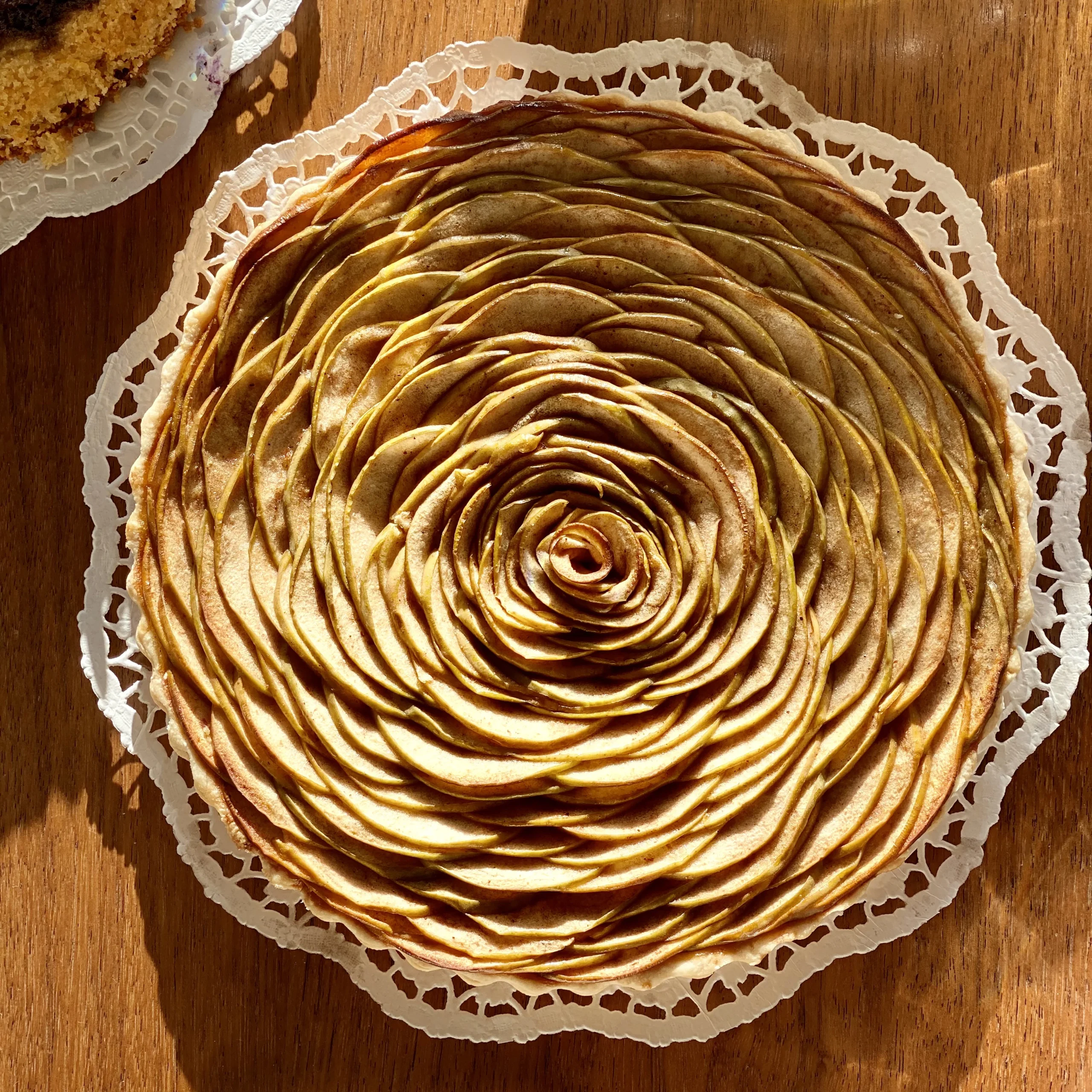 Thinly sliced apples rolled into delicate rose shapes, set on a buttery almond cream tart.