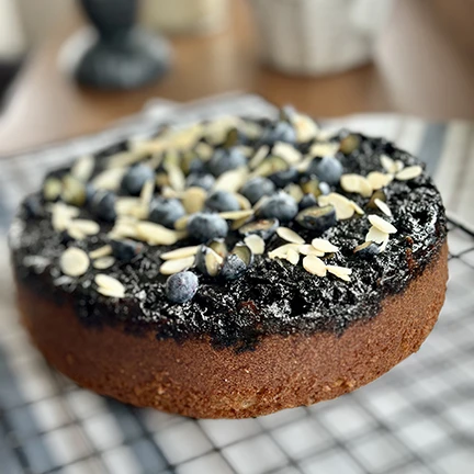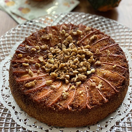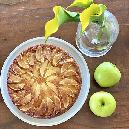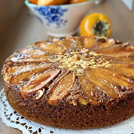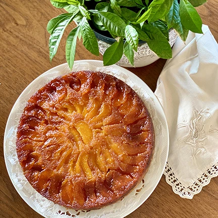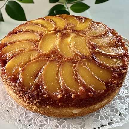Moist cake crowned with caramelized seasonal fruits like apricots, peaches, blueberries, pineapple, and apples.