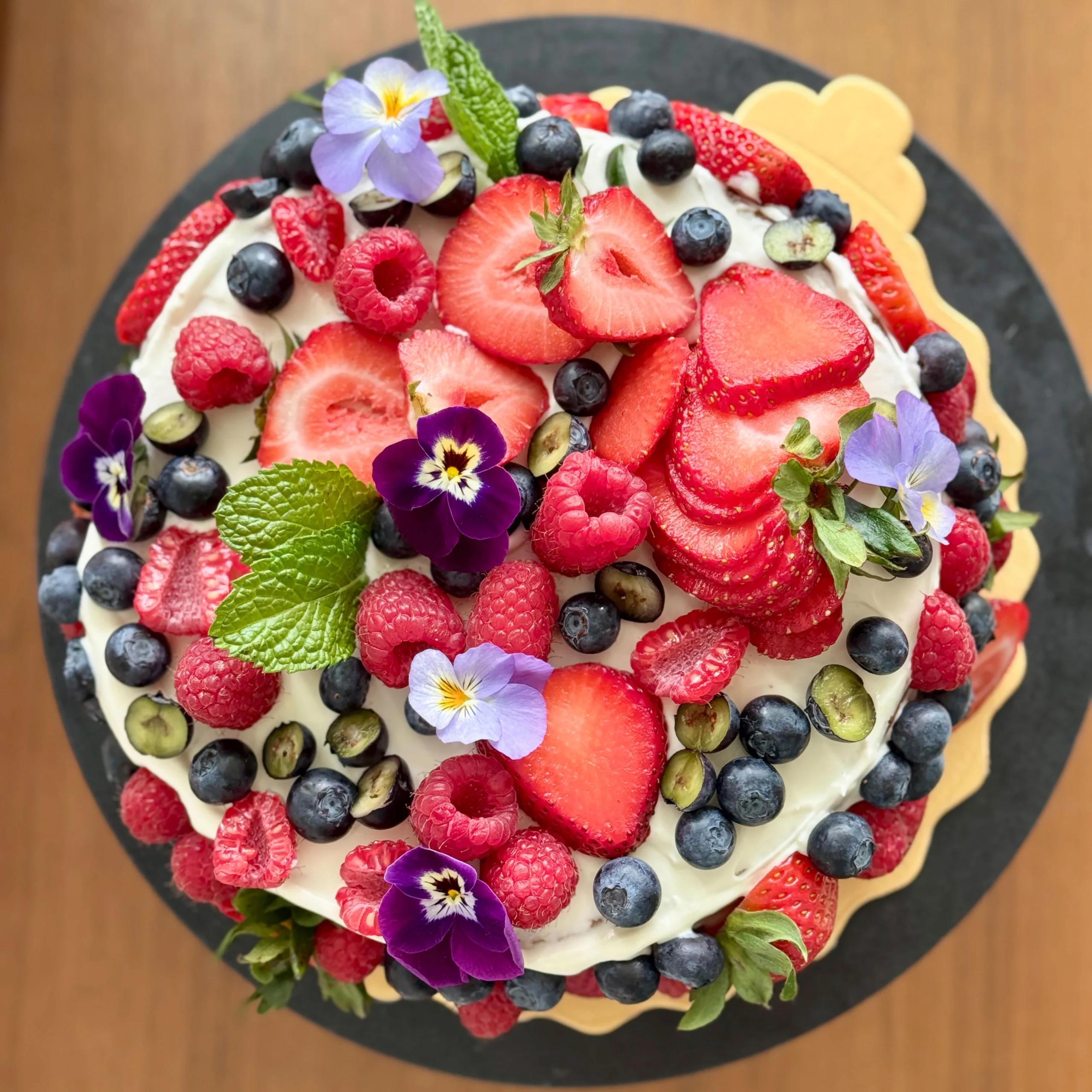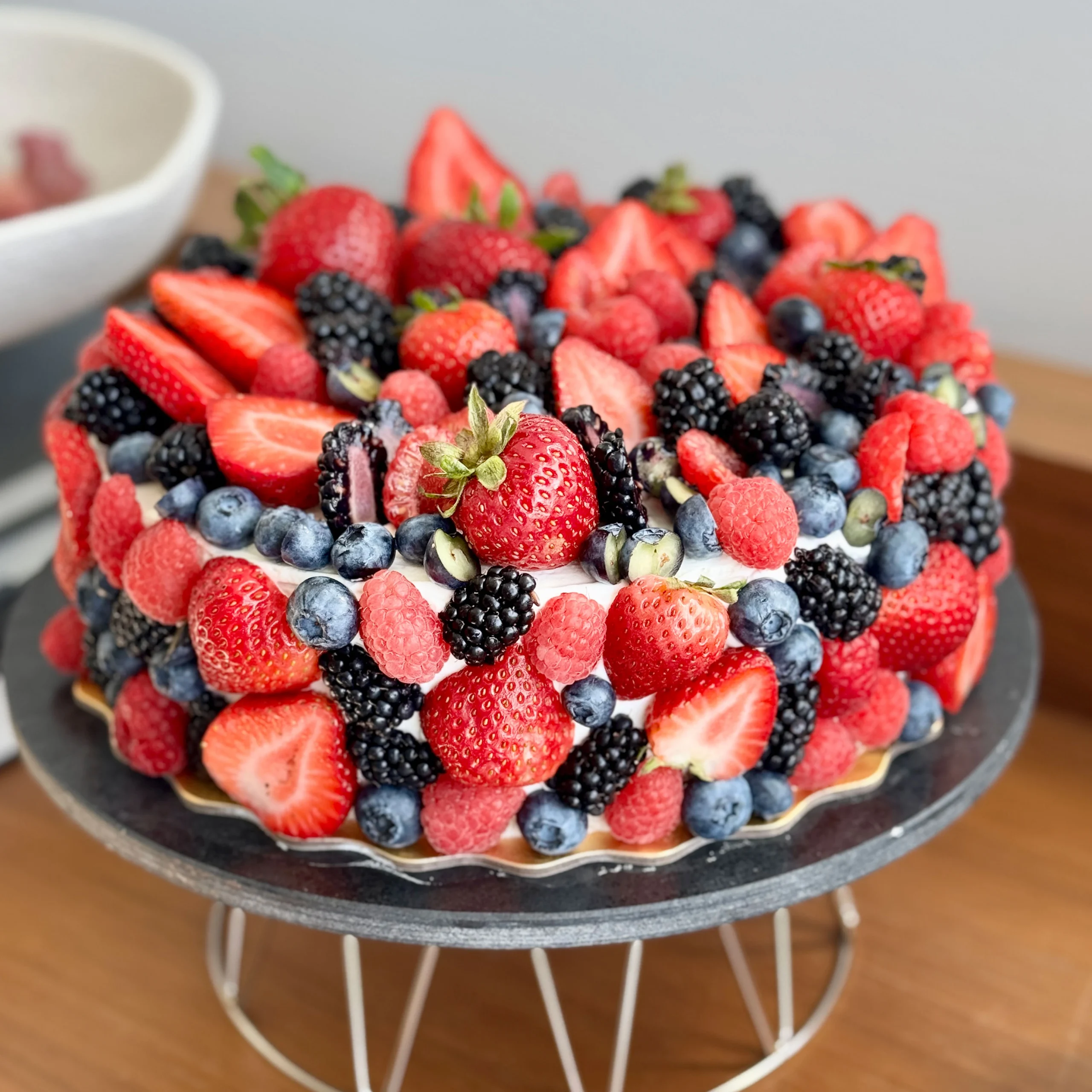 Soft vanilla cake layered with tangy vanilla cream cheese filling and a vibrant mix of fresh berries, fully covered with a generous crown of juicy, colorful berries—a bright, fresh, and festive celebration cake.